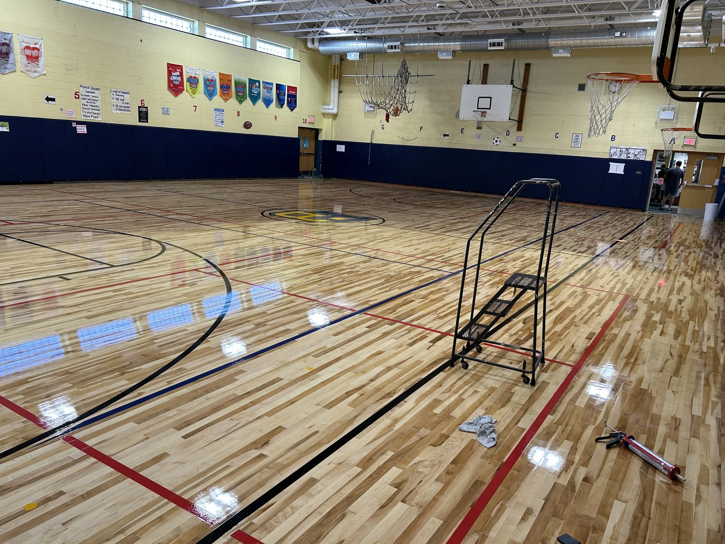 Provided a new wood gymnasium flooring system including vented perimeter base with game lines and other relaxed markings.